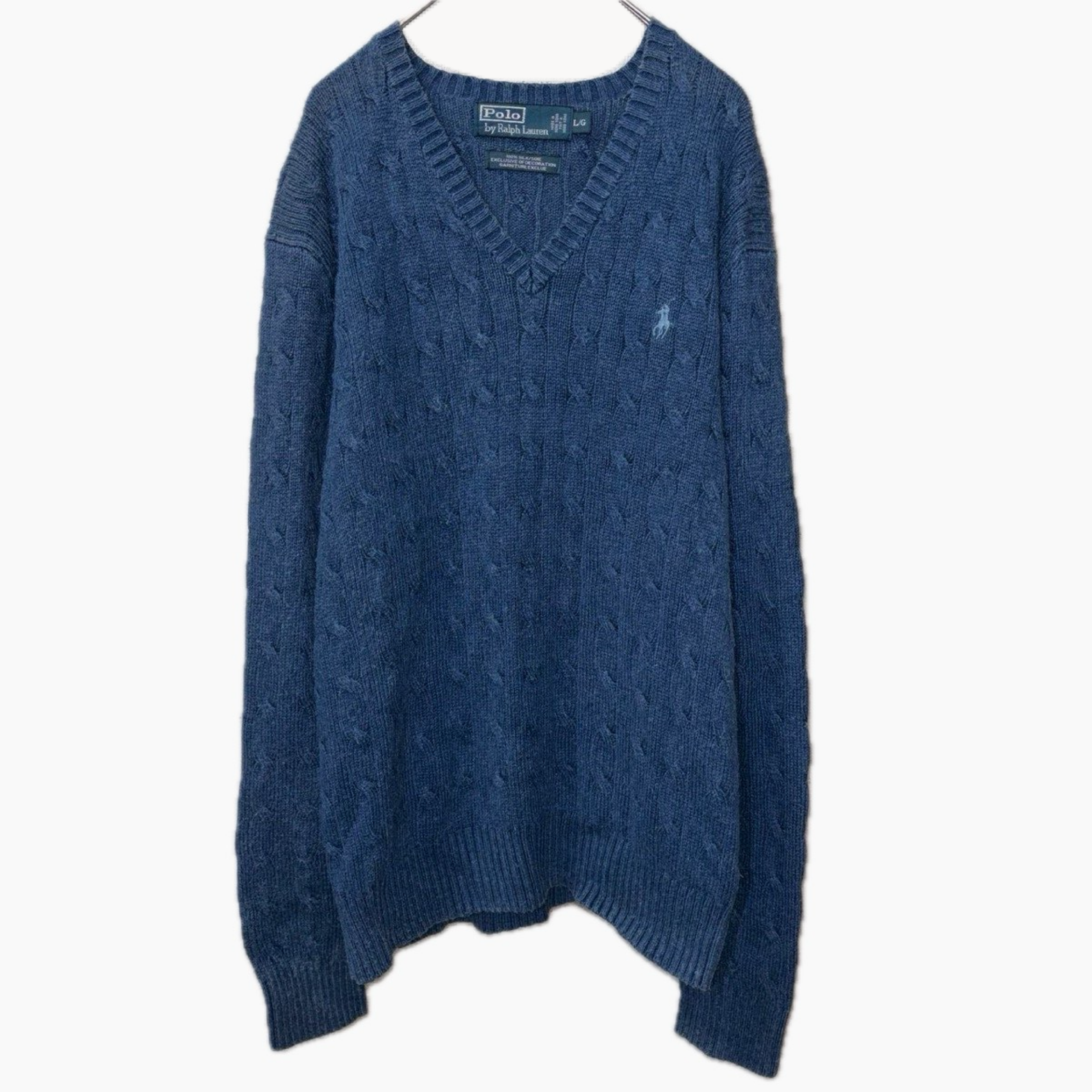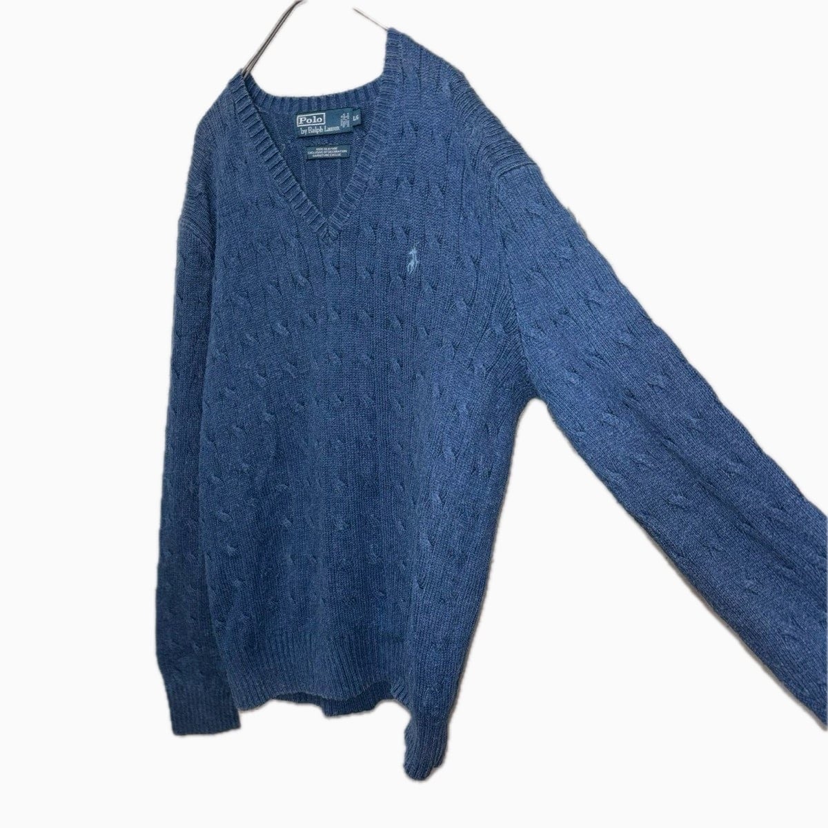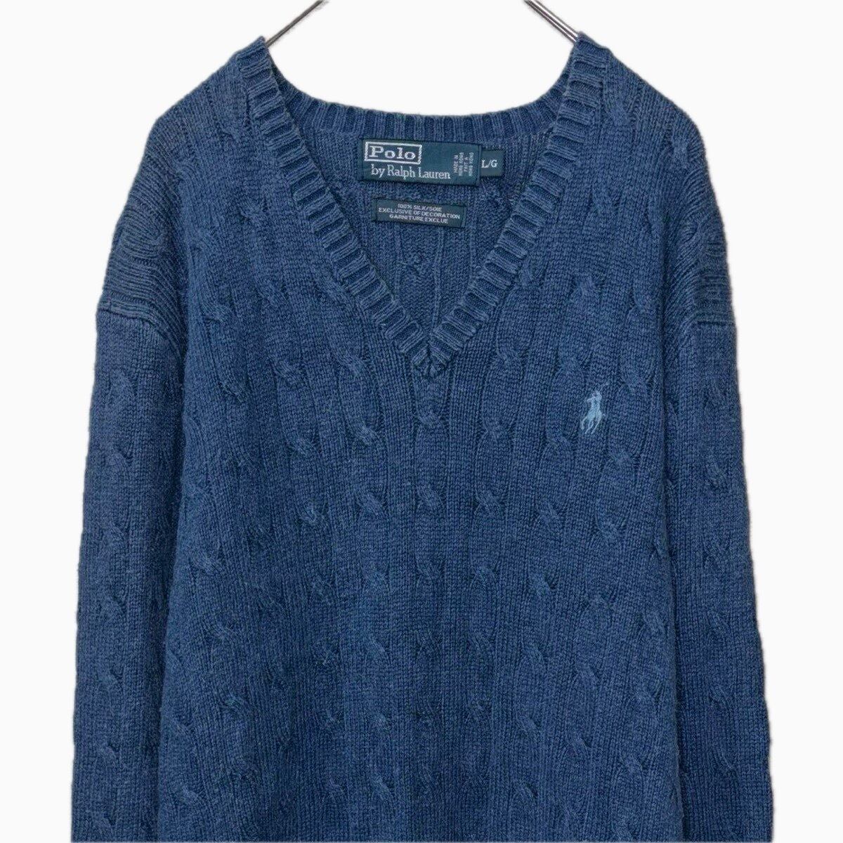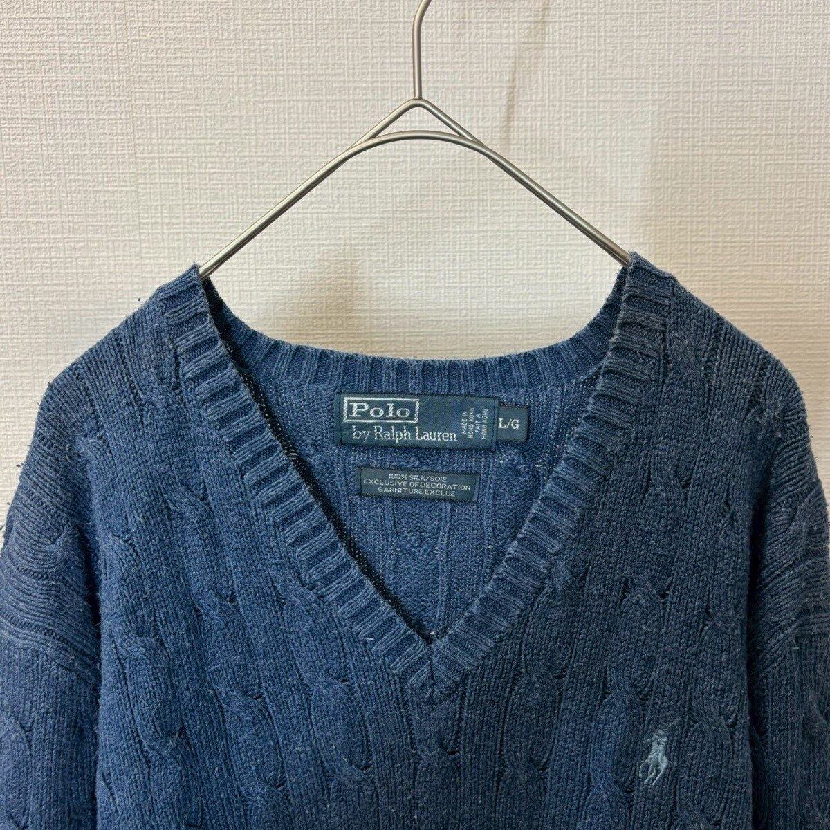【item】 :ポロラルフローレン ケーブルニットセーター Vネック シルク100% 青 刺繍